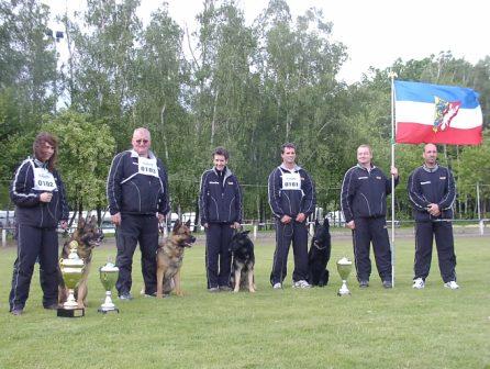 v.l.n.r.: Regine Schwellnus "Racoon v.d. schwarzen Nister", Dirk Stocks "Falko vom Wällerhorst", Kirsty-Marthe Weber "Oberst op de Hyde (Ersatz), Kai Linde "Ole von den Wannaer Höhen", Mannschaftsführer Andreas Bölke, Schutzdiensthelfer Teil 1 Klaus Meyer